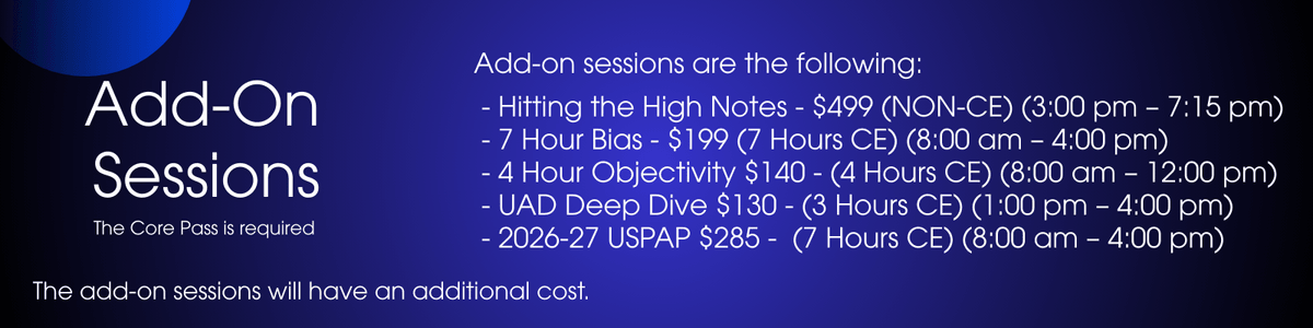 4:00 Trade Show Opening Reception: Join us as the trade show gets into full swing with lite hors d'oeuvres and a cash bar, surrounded by appraisers, AMCs, lenders, and other companies who support the valuation process.Note: There is no CE included in a Core Pass. If you want to add pre-conference courses (Monday), the Pro Pass (Tuesday and Wednesday), or the post-conference courses (Thursday), please click to add them when you register below. There is an additional charge for CE Classes.