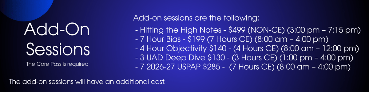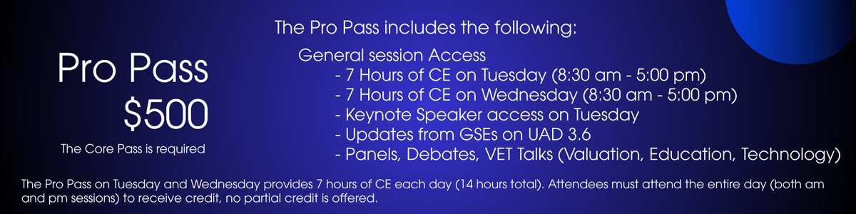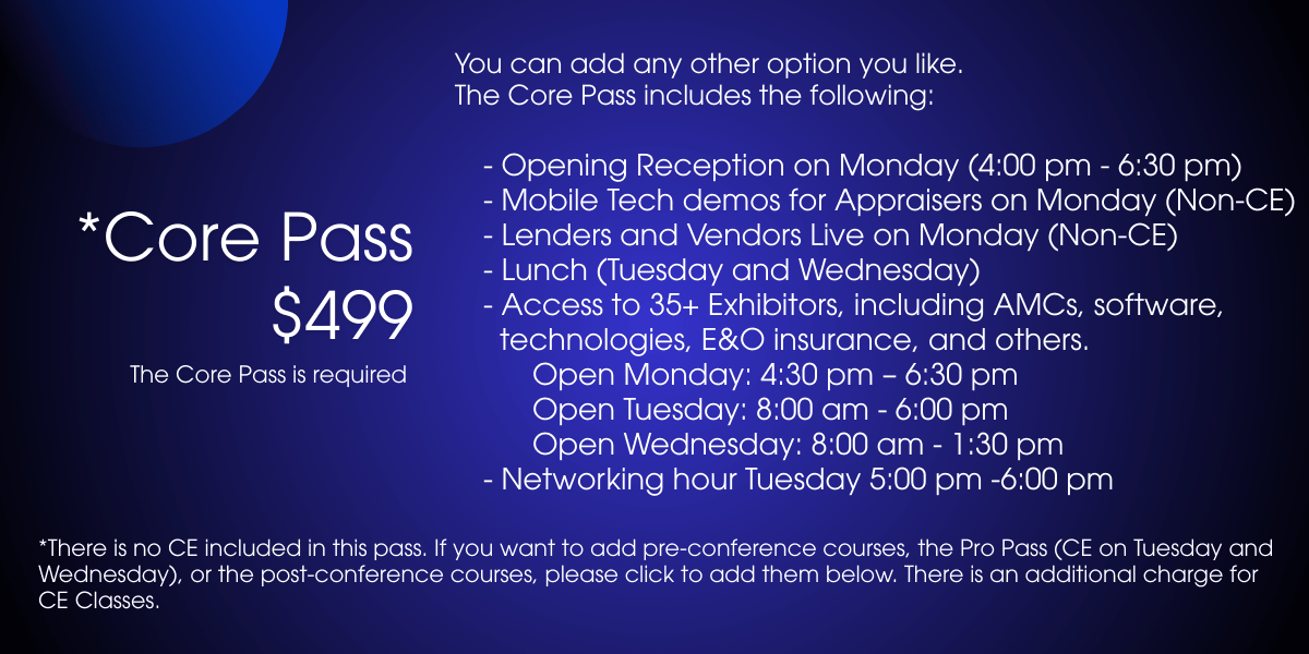 4:00 Trade Show Opening Reception: Join us as the trade show gets into full swing with lite hors d'oeuvres and a cash bar, surrounded by appraisers, AMCs, lenders, and other companies who support the valuation process.Note: There is no CE included in a Core Pass. If you want to add pre-conference courses (Monday), the Pro Pass (Tuesday and Wednesday), or the post-conference courses (Thursday), please click to add them when you register below. There is an additional charge for CE Classes.